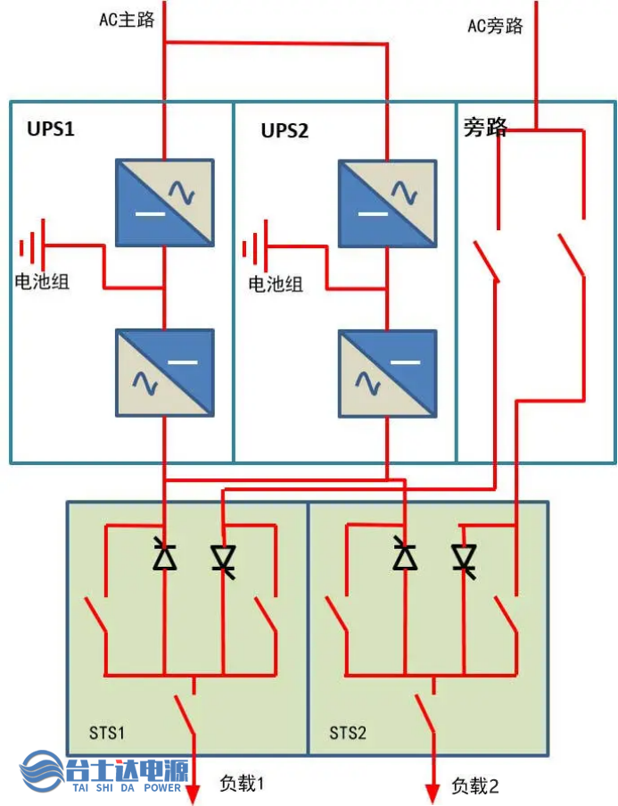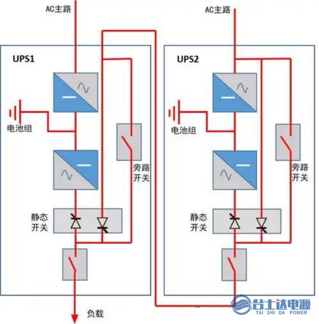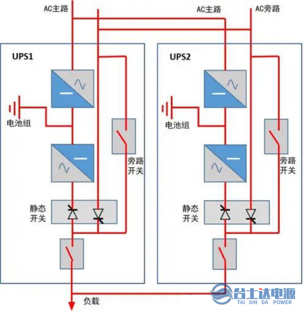 旁路式UPS冗余模式属于热备模式,即:在同一时刻只用一台UPS为负载提供电力,另一台等着,一旦运行着的主UPS故障,等待的UPS立即接管负载。原理如下: