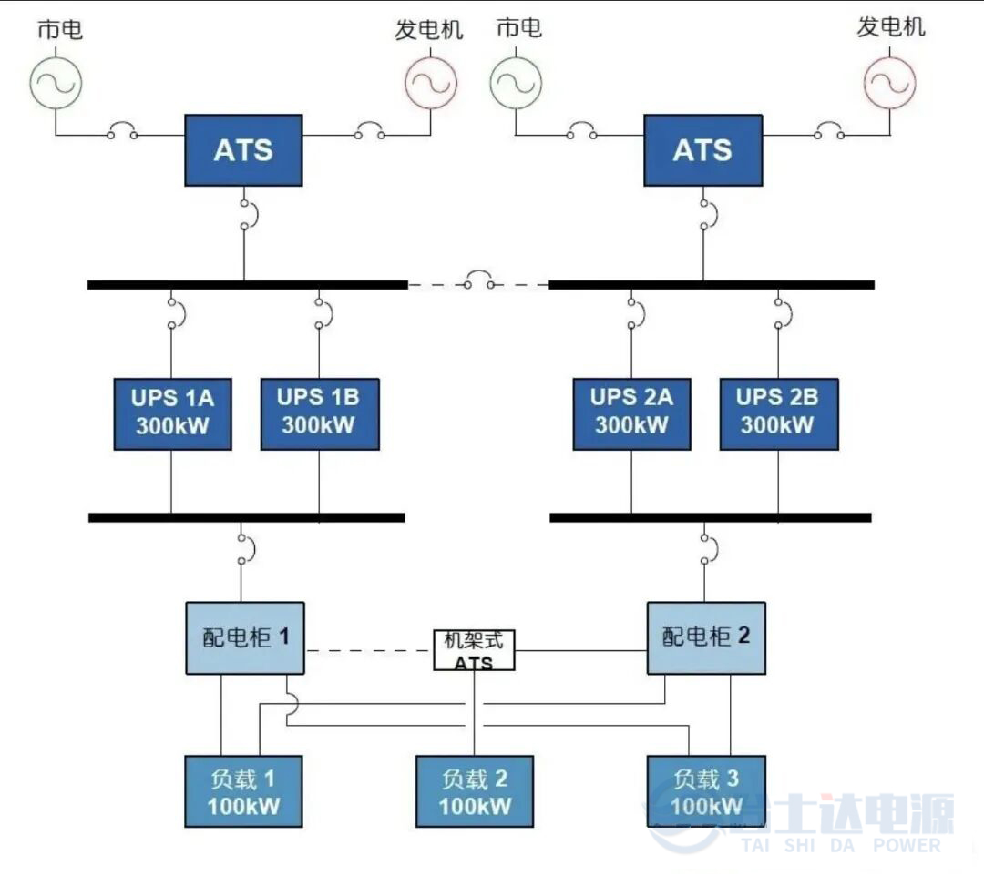 架构:在分布式冗余基础上增加静态转换开关(STS)。