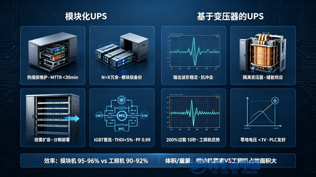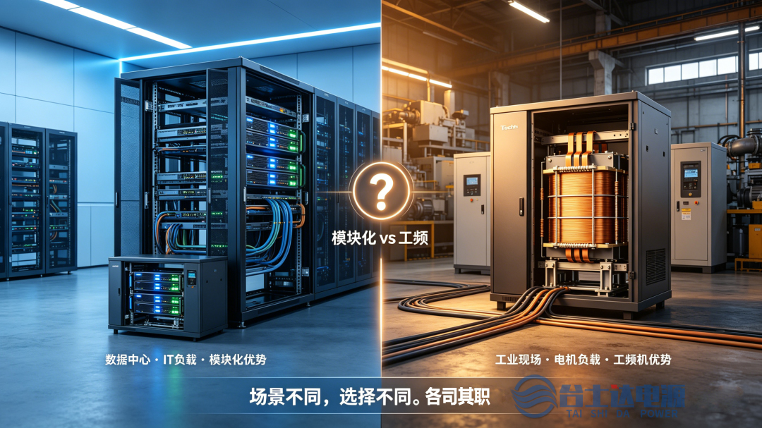 去年一个数据中心改造项目,业主那边两个方案争了很久。一方推模块机,说热插拔维护方便、扩容灵活。另一方死守工频机,说扛过载能力强、输出波形干净。两边都有道理,谁也说服不了谁。 最后我把两台样机拉到现场做了个对比测试。模块机功率模块拔插确实快,工频机带非线性负载时电压波形确实稳。但测完业主反而更纠结了——因为两种机型压根不是替代关系,是用在不同场景的东西。 讲真,这个问题我碰到过很多次。很多人把模块化和高频化混为一谈,又把工频机当成“老古董”。在这里需要先把几个概念掰扯清楚。
