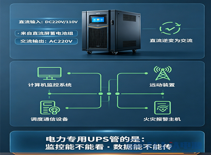 电力专用UPS伺候的是计算机监控系统、远动装置、调度通信设备、火灾报警主机。这些设备用的是交流电。UPS管的是“监控能不能看、数据能不能传”。