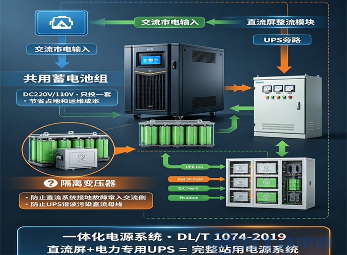两者的关系在行业标准DL/T 1074-2019里写得很清楚,直流屏、电力专用UPS、通信电源统一纳入一体化电源系统框架。实际项目中共用同一组蓄电池是标准做法——直流屏配套的电池组给UPS提供直流输入,常见电压DC220V或110V,UPS逆变成交流供给监控通信设备。这样做电池只投一套,占地和运维成本都降下来了,系统整体可靠性反而更高。