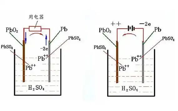 在充电过程中,阴极发生反应:PbSO4 + 2e- = Pb + SO42-,阳极则发生:PbSO4 - 2e- + 2H2O = PbO2 + 4H+ + SO42-,总反应为:2PbSO4 + 2H2O = Pb + PbO2 + 2H2SO4。充电过程中,放热反应导致电池发热,同时观察到内阻下降(正负极活性物质得到恢复,硫酸铅被反应掉),电解液浓度上升(充电时,蓄电池中会产生硫酸,使得电解液浓度升高)。高温、高电压环境下充电时,水会发生电解产生氧气,进而氧化电池的正负极板,导致正极板腐蚀。